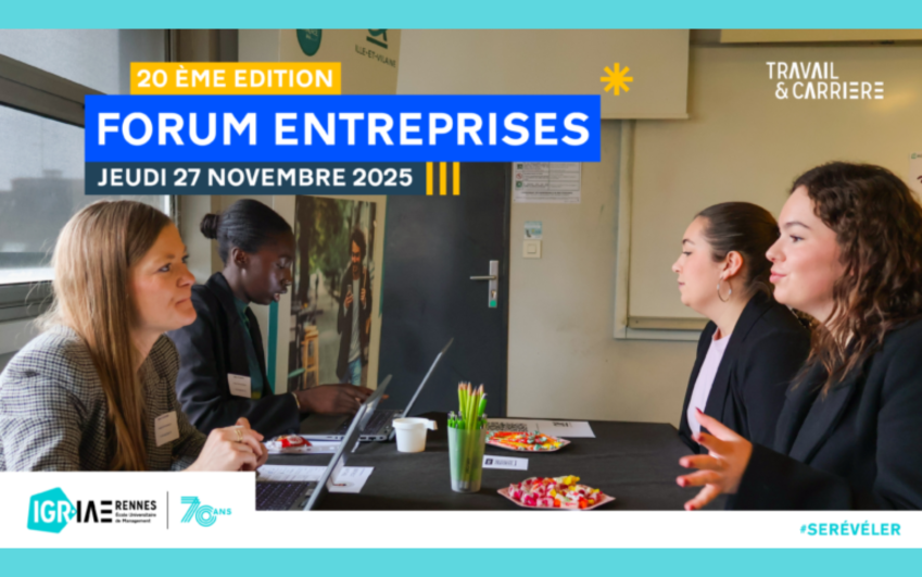 L’IGR-IAE Rennes accueille le jeudi 27 novembre 2025, la 20ème édition de son Forum Entreprises, un temps fort de l’année universitaire, d’autant plus symbolique cette année qu’il s’inscrit dans le cadre des 70 ans de l’institut.
