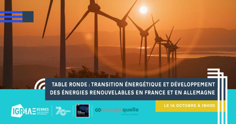 L’IGR-IAE Rennes, en partenariat avec le CAFA Bretagne, organise une table ronde exceptionnelle le mardi 14 octobre à 18h00 (Amphithéâtre Claude Champaud) sur le thème de la transition énergétique et du développement des énergies renouvelables en France et en Allemagne.